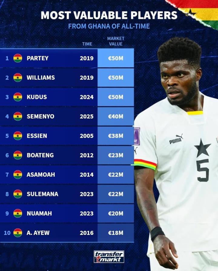 北京时间10月13日,德转统计出了加纳球员历史身价榜,托马斯-帕尔特伊、伊尼亚基-威廉斯以及库杜斯同以5000万欧元并列第一,塞门约、埃辛、凯文-博阿滕、夸多-阿萨莫阿、安德烈-阿尤上榜。