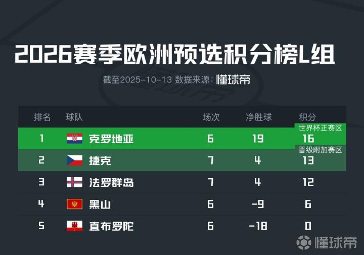 不过,捷克的对手直布罗陀是小组公认最弱的球队,而法罗群岛面对的克罗地亚是小组头名。