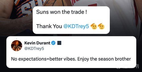 杜兰特很快回复了这名球迷,他写道:“没有期望=更好的氛围,享受赛季吧,兄弟!”