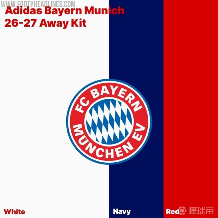 拜仁慕尼黑2026/27赛季客场球衣以白色为主色调,与2025/26赛季客场球衣的主色保持一致,配色预计为海军蓝和红色。