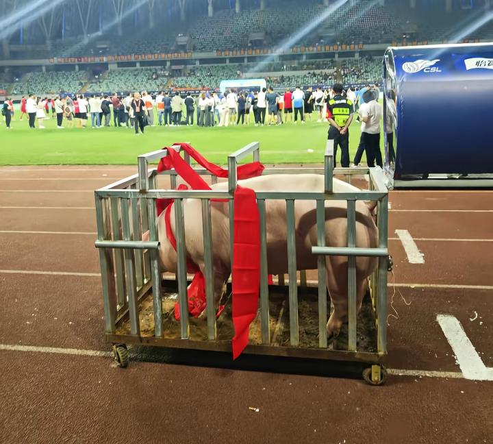 颁奖仪式期间,作为冠军球队的奖励,一头400斤重的猪被赛事工作人员用推车推到了场地中央。冠军队球员合影时,这头猪也是格外“抢眼”。