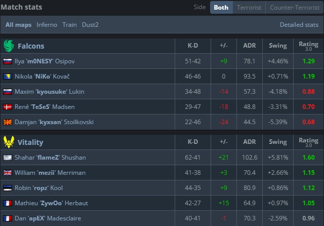 来到图三后Falcons被彻底碾压,mezii接管比赛,小蜜蜂多点开花一波带走比赛。总决赛数据中,VIT除apEX外全部飘绿,ZywOo仅位列队伍第4位,而Falcons仅尼孩打出水平,kyousuke与TeSeS两位步枪手发挥欠佳。