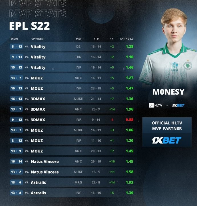 整个系列赛m0NESY打出统治级别表现,平均Rating达到1.38,以败方身份拿下HLTV-MVP奖牌,这也是他本年度首个MVP,职业生涯第5个MVP头衔。