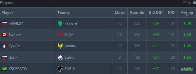 小孩出战15张地图,Rating比ZywOo高出0.1,重返FaZe的总监Twistzz位列赛事第2位,基本锁定进入EPL-S22最佳阵容+EVP头衔。