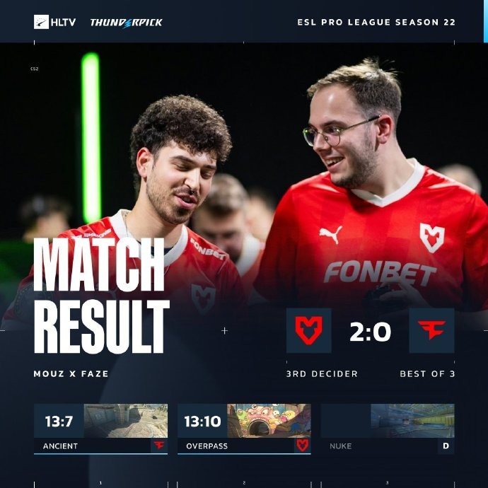 此外,在三四名决赛中,MOUZ轻松击败FaZe。