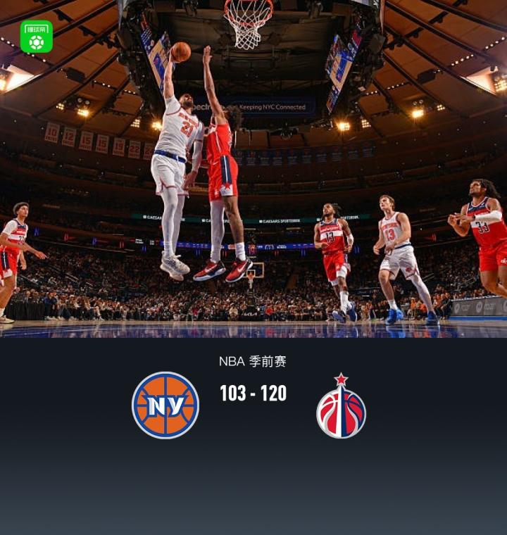 第四节尼克斯托桑-埃夫布翁万拿下7分,奇才贾米尔-沃特金斯拿下7分,最终尼克斯103-120不敌奇才