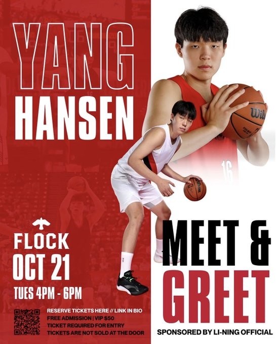 北京时间今日,据开拓者队中文随队记者Victor Sun个人社媒消息,杨瀚森将于当地时间下周二(10月21日)参加李宁在波特兰FLOCK美食大厅举办的球迷见面会。