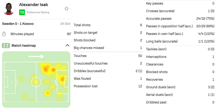 伊萨克本场比赛6次射门2次射正,错失1次绝佳机会,2次盘带1次成功,防守端完成1次拦截,1次夺回球权。50次触球,32脚传球,传球成功率75%。
