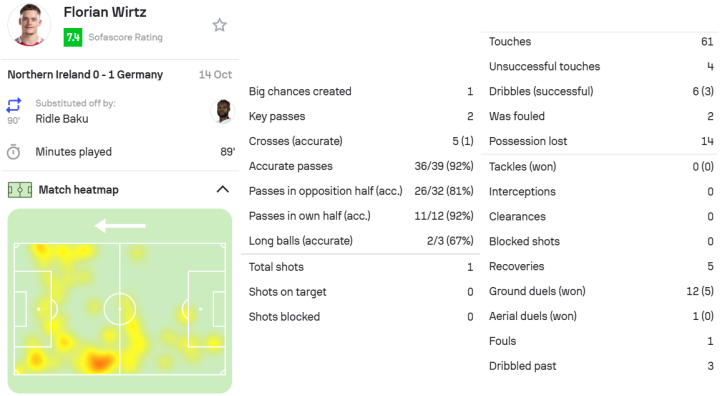 维尔茨本场比赛完成1次射门,6次盘带3次成功,防守端5次夺回球权。61次触球,39脚传球,包含2脚关键传球,创造1次绝佳机会,传球成功率92%。