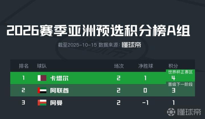 亚预赛第四阶段首轮比赛中,A组的卡塔尔0-0战平阿曼,而阿联酋2-1战胜阿曼,这样阿联酋在第2轮的比赛中只要不输给卡塔尔,就可以顺利晋级世界杯。B组的沙特和伊拉克先后战胜印尼同积3分,第2轮比赛谁获胜就将晋级世界杯正赛。