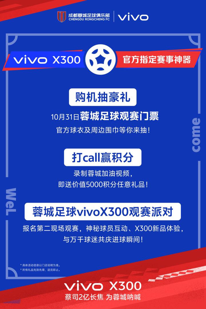 即日起,购买vivo X300即有机会抽取10月31日蓉城主场观赛门票、官方正品球衣及专属周边围巾。手握官方神器,亲临现场见证奇迹!