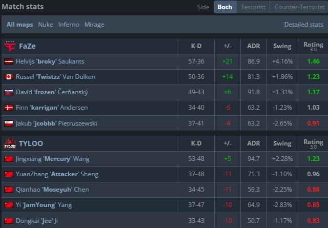 决胜图Mirage,天禄防守方收获5-0梦幻开局,但此后枪法频频变形,Jee大狙手感冰凉,目送FaZe回敬5-0小高潮,最终FaZe 13-8赢下图三。