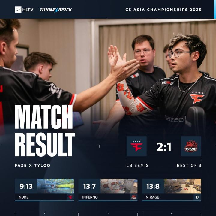 北京时间10月16日,CS2025亚洲邀请赛(CS Asia Champion)小组赛,中国战队TYLOO 1-2不敌FaZe,与另一支CN战队LVG战绩同为1胜2负,无缘晋级。