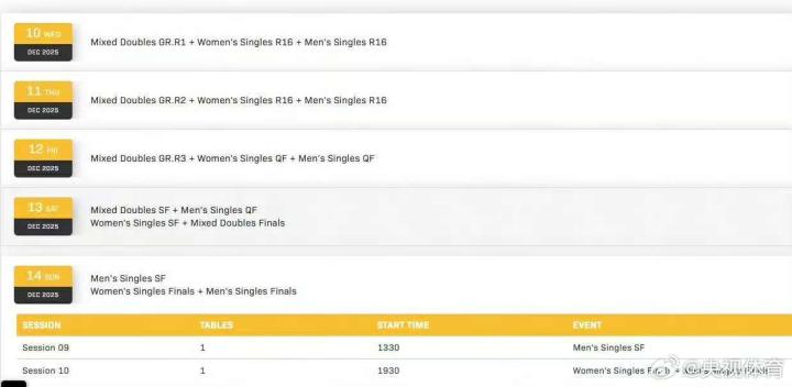 北京时间今日,2025WTT香港总决赛赛程公布,比赛将于12月10日-14日在中国香港红磡体育馆进行。