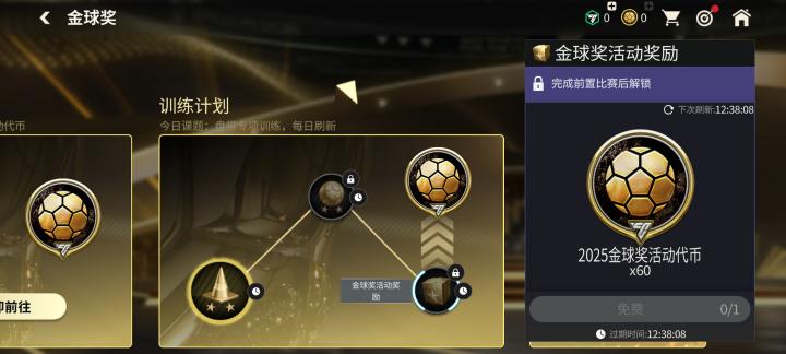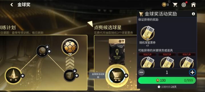 每日参与训练计划,完成相关赛事后,可以获得60枚金球奖活动代币,该代币可以在章节内继续抽取球星票券。