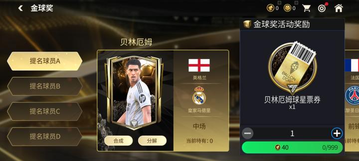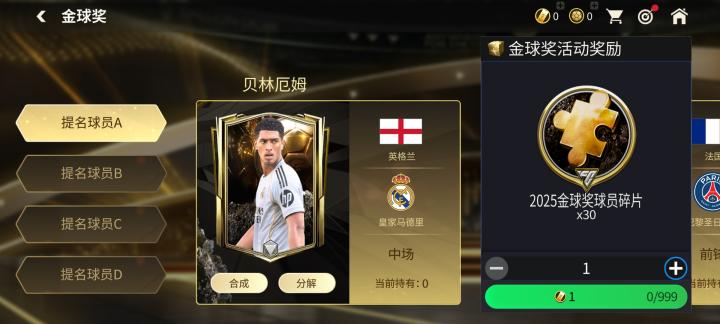 分解任一普通球星票券,可以获得金球奖球员碎片30枚