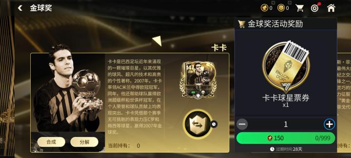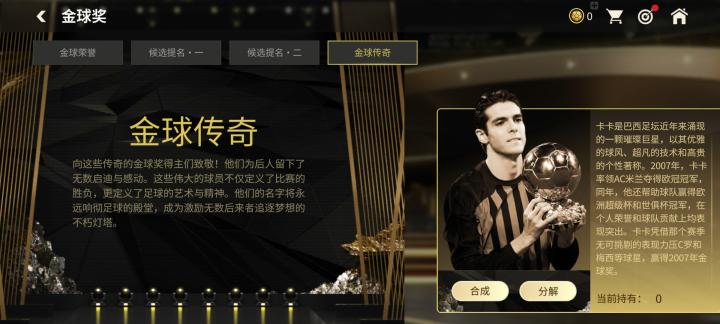 金球传奇章节中,玩家可以合成、分解传奇球星票券,使用传奇球星票券,可以参与卡卡、菲戈、巴乔三位金球奖传奇球员的特惠定向交换。