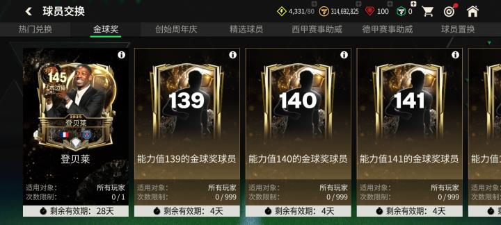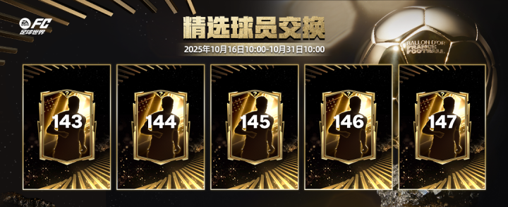 金球奖团队1球员中,除上文金球传奇章节内的1477卡卡、146菲戈、145巴乔三位金球奖传奇球员可以特惠定向交换获取外,本年度的金球奖得主,登贝莱的全新球员也将通过特惠定向交换的方式推出,玩家可以在球员交换页面参与交换,获得这位法国巨星。
