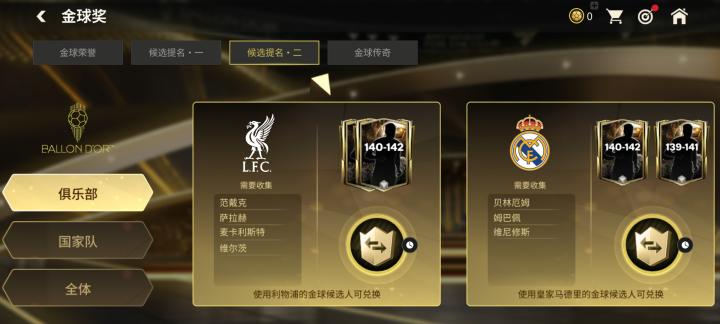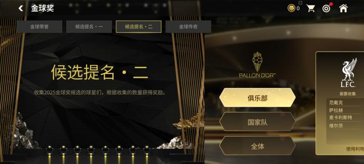 以利物浦俱乐部奖励为例,玩家需要收集来自利物浦俱乐部的四位26金球奖球员,范戴克、萨拉赫、麦卡利斯特、维尔茨四人的球星票券。