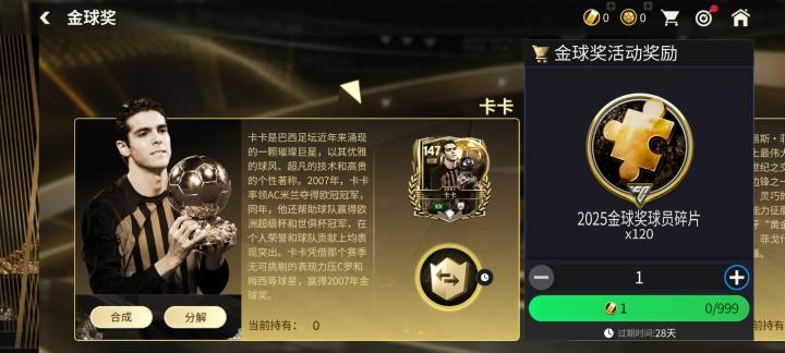 分解任一传奇球星票券,可以获得金球奖球员碎片120枚