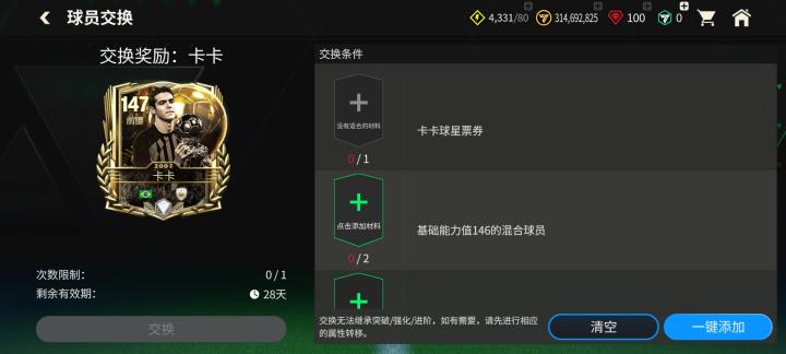 以147能力值金球奖传奇球员卡卡为例,玩家使用卡卡球星票券,以及对应能力值的条件球员,即可特惠定向交换获得这位超级传奇。