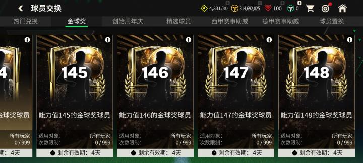 本周四金球奖活动上线后,金球奖球员:团队1同步推出,本组球员基础能力值为能力值139-148,共计45人。148能力值球员有里瓦尔多、卡纳瓦罗、舍甫琴科、内德维德、尤西比奥五人,玩家可以通过球员对应能力值的交换卡池获取。