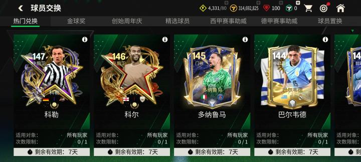 本周更新后,球员交换部分迎来了142能力值百战功勋阿尔贝托、143能力值年度最佳哈兰德、144能力值美洲杯巴尔韦德、145能力值年度最佳多纳鲁马、146能力值像素大作战科尔、147能力值像素大作战科勒,六项定向交换在内的,共计七项交换项目。