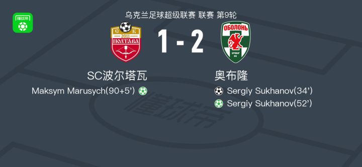 北京时间10月17日,乌克兰足球超级联赛第9轮,SC波尔塔瓦主场迎战奥布隆。比赛中,奥布隆球员Sergiy Sukhanov接队友助攻率先打破僵局。下半场,Sergiy Sukhanov再次建功,通过点球为球队扩大领先优势。临近比赛结束,SC波尔塔瓦球员Maksym Marusych主罚点球命中,扳回一城。最终全场比分定格为SC波尔塔瓦1-2奥布隆。