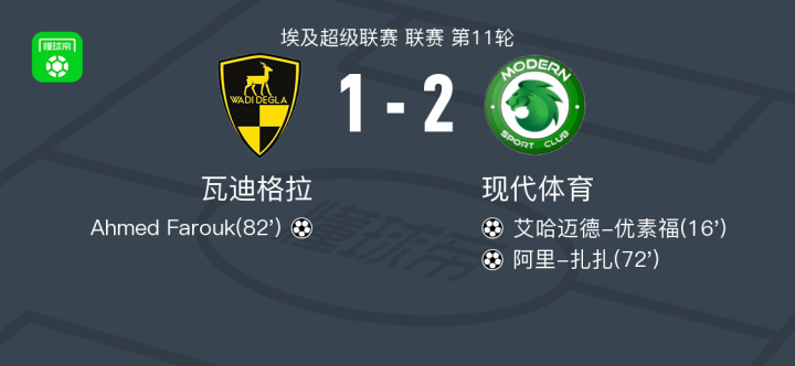 北京时间10月17日埃及超级联赛 联赛 第11轮,瓦迪格拉主场对阵现代体育。瓦迪格拉Ahmed Farouk破门。现代体育艾哈迈德-优素福破门,阿里-扎扎破门。最终比分瓦迪格拉 1-2 现代体育。