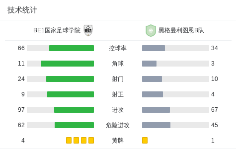 北京时间10月17日,立陶宛乙级联赛第27轮,BE1国家足球学院主场迎战黑格曼利图恩B队。比赛中,黑格曼利图恩B队由karolis janusa率先破门,取得领先。随后,BE1国家足球学院球员kuhle bekwayo扳平比分。进入下半场,BE1国家足球学院球员Domantas Šluta不慎将球打入自家球门,使对手再度领先。比赛临近结束前,Justas Paštukas为黑格曼利图恩B队再入一球,锁定胜局。最终,双方战成1-3,黑格曼利图恩B队客场取胜。