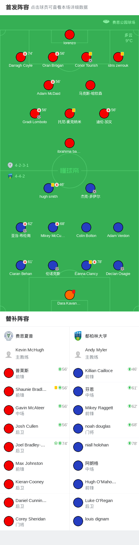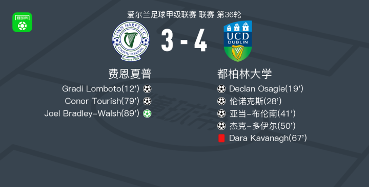 北京时间10月18日爱尔兰足球甲级联赛 联赛 第36轮,费恩夏普主场对阵都柏林大学。费恩夏普Gradi Lomboto破门,Conor Tourish破门,Joel Bradley-Walsh破门。都柏林大学Declan Osagie破门,伦诺克斯破门,亚当-布伦南破门,杰克-多伊尔破门。最终比分费恩夏普 3-4 都柏林大学。