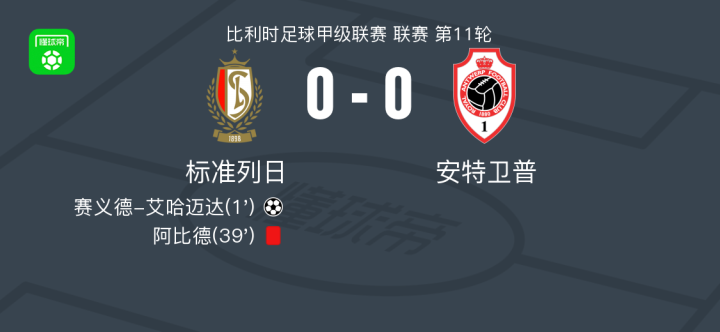 北京时间10月18日比利时足球甲级联赛 联赛 第11轮,标准列日主场对阵安特卫普。标准列日赛义德-艾哈迈达破门。最终比分标准列日 - 安特卫普。