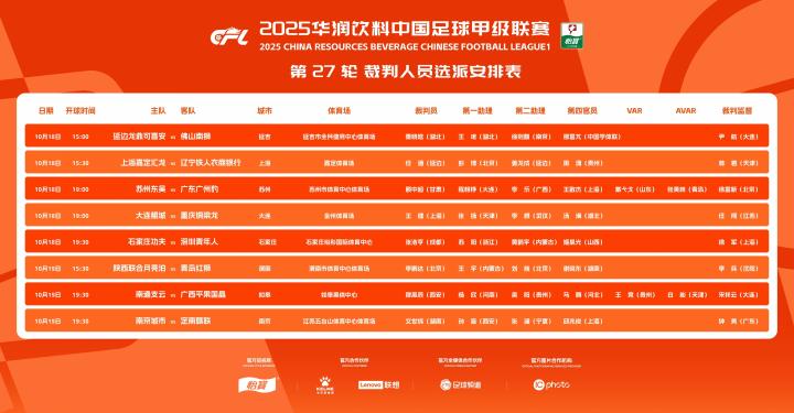 北京时间10月18日,中甲第27轮裁判名单公布,苏州东吴vs广东广州豹、南通支云vs广西平果启用VAR。