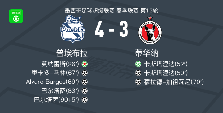 北京时间10月18日墨西哥足球超级联赛 春季联赛 第13轮,普埃布拉主场对阵蒂华纳。普埃布拉里卡多-马林破门,Alvaro Burgos破门,巴尔塔萨梅开二度。蒂华纳卡斯塔涅达梅开二度,穆拉德-加祖瓦尼破门。最终比分普埃布拉 4-3 蒂华纳。