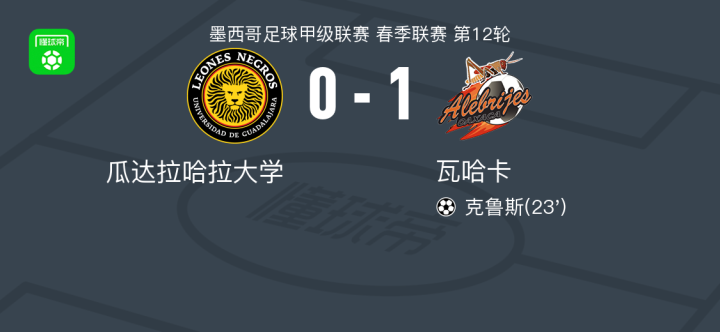 萨卡特佩克1-0瓜达拉哈拉大学,克鲁斯制胜球战报bot @懂球帝2025-10-18 12:01北京时间10月18日墨西哥足球甲级联赛 春季联赛 第12轮,瓜达拉哈拉大学主场对阵瓦哈卡。瓦哈卡克鲁斯破门。最终比分瓜达拉哈拉大学 0-1 萨卡特佩克。点击查看本场比赛详细数据>>点击查看墨甲完整积分榜>>精彩瞬间第23分钟,瓦哈卡球员马斯科罗助攻克鲁斯打入一球。 技术统计 展开更多