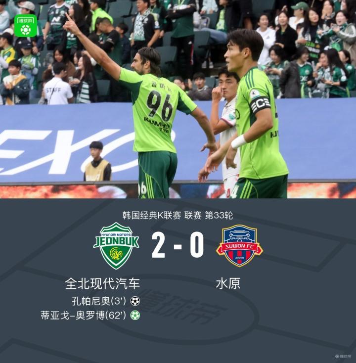 北京时间10月18日,韩国经典K联赛第33轮展开较量,全北现代汽车坐镇主场迎战水原FC。比赛伊始,金太焕送出精准助攻,帮助孔帕尼奥率先打破僵局。随后,蒂亚戈-奥罗博在比赛中主罚点球命中,为球队扩大领先优势。最终,全北现代汽车以2-0战胜水原FC。