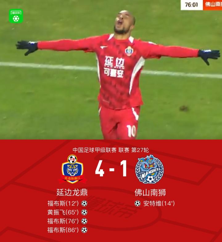 延边龙鼎4-1佛山南狮,福布斯戴帽,黄振飞、安特维建功