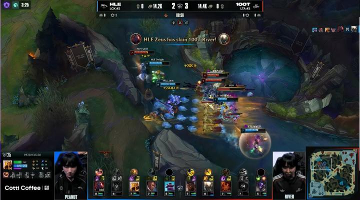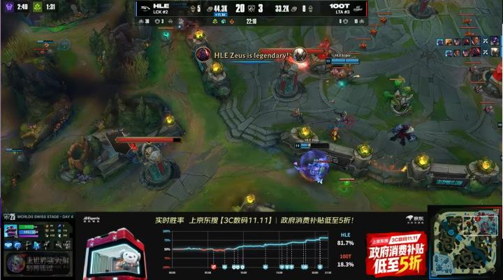 第9分钟巢虫团,虽然100T拼尽全力击杀了赵信,但随后HLE大获全胜打出1换4;