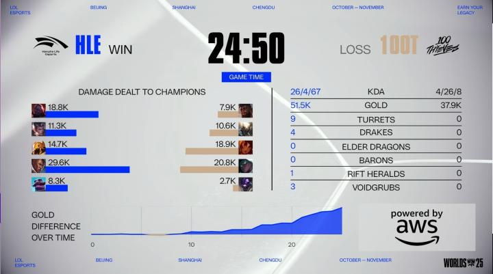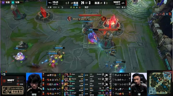 第24分钟,随着Viper卢锡安同样超神,HLE推平100T基地赢下本局游戏。