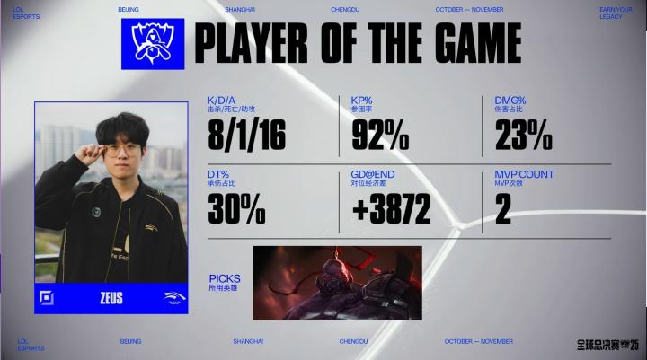 本局游戏MVP毫无疑问给到最亮眼的上单Zeus赛恩。