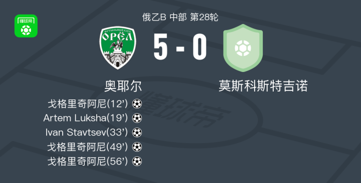 北京时间10月18日,俄乙B中部赛区第28轮展开较量,奥耶尔迎战莫斯科斯特吉诺。比赛中,戈格里奇阿尼率先为奥耶尔取得进球,随后Artem Luksha接应进攻再下一城。Ivan Stavtsev持续扩大领先优势,将比分进一步拉开。下半场戈格里奇阿尼再度发力,先后两次攻破对方球门,完成个人本场比赛的帽子戏法。全场比赛结束,奥耶尔以5比0战胜莫斯科斯特吉诺。