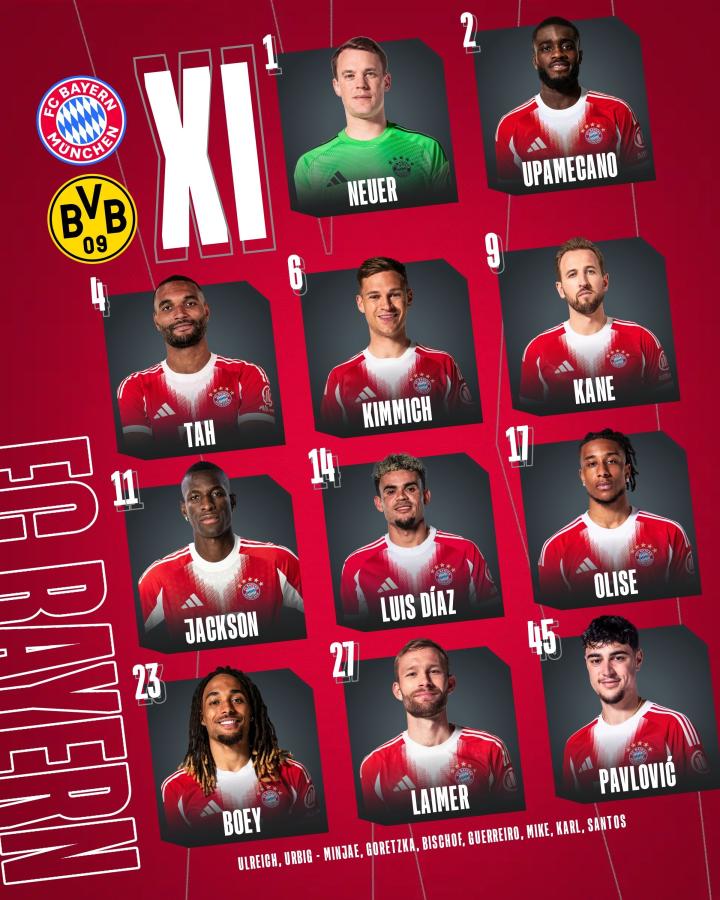 拜仁慕尼黑首发:1-诺伊尔、23-博埃、2-于帕梅卡诺、4-约纳坦-塔、27-莱默尔、45-亚历山大-帕夫洛维奇、6-基米希、11-尼古拉-雅克松、17-奥利塞、14-路易斯-迪亚斯、9-哈里-凯恩