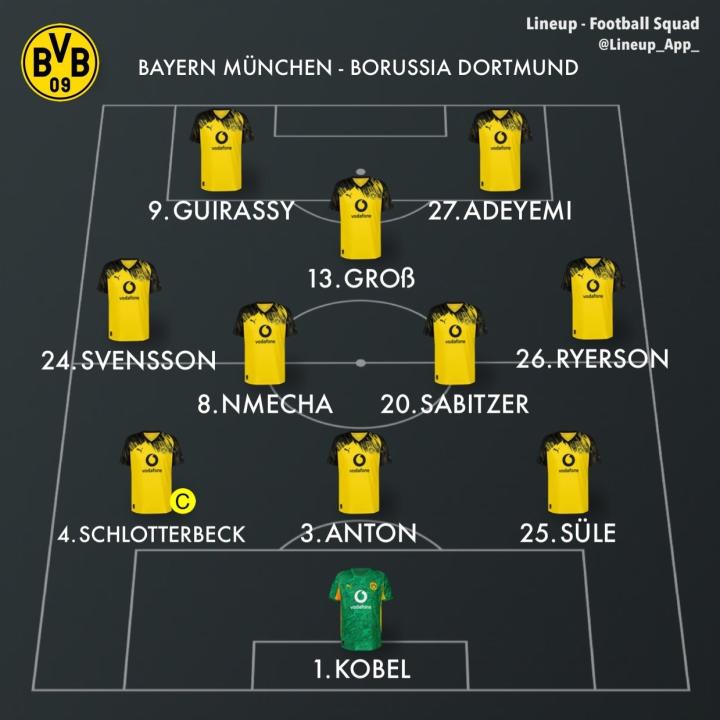 多特蒙德首发:1-科贝尔、3-安东、4-施洛特贝克、26-瑞尔森、25-聚勒、24-丹尼尔-斯文松、8-费利克斯-恩梅加、20-萨比策、13-格罗斯、27-阿德耶米、9-吉拉西