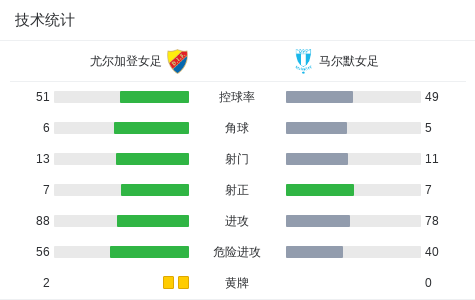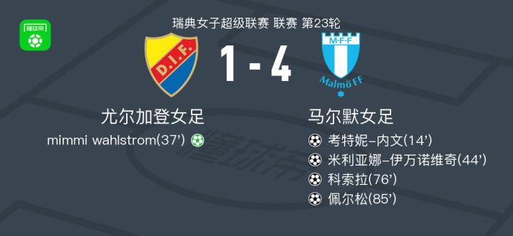 马尔默女足4-1大胜尤尔加登女足,佩尔松、科索拉建功
