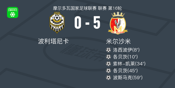 北京时间10月18日,摩尔多瓦国家足球联赛第16轮,波利塔尼卡主场迎战米尔沙米。比赛中,洛西波伊率先破门,为米尔沙米取得领先。随后各贝茨连入两球,进一步扩大比分优势。上半场临近结束前,索林-凯莱再下一城,帮助球队确立明显领先。易边再战,波斯马克锦上添花,将进攻成果延续至终场。最终全场比分定格在波利塔尼卡 0-5 米尔沙米。