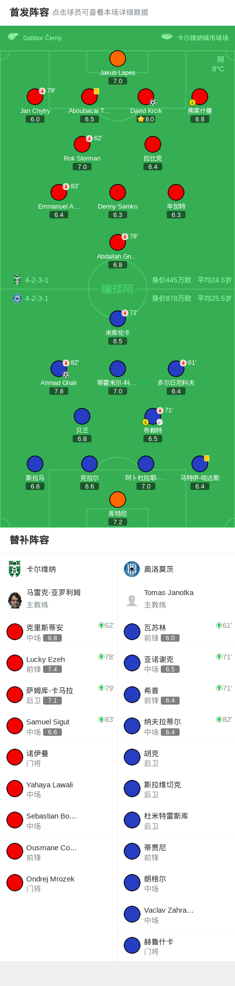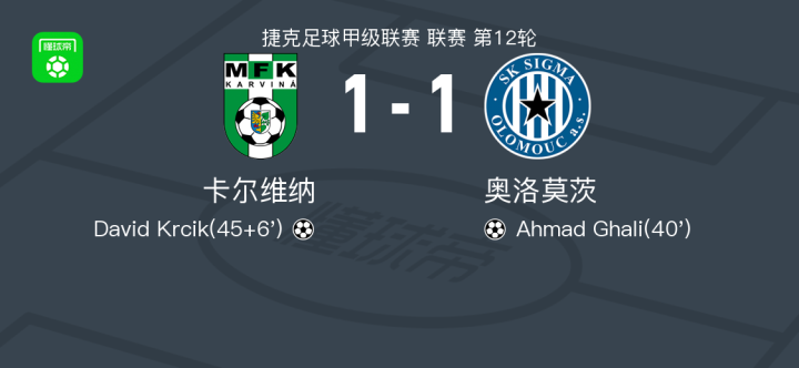 卡尔维纳1-1奥洛莫茨,Ahmad Ghali破门,David Krcik扳平比分