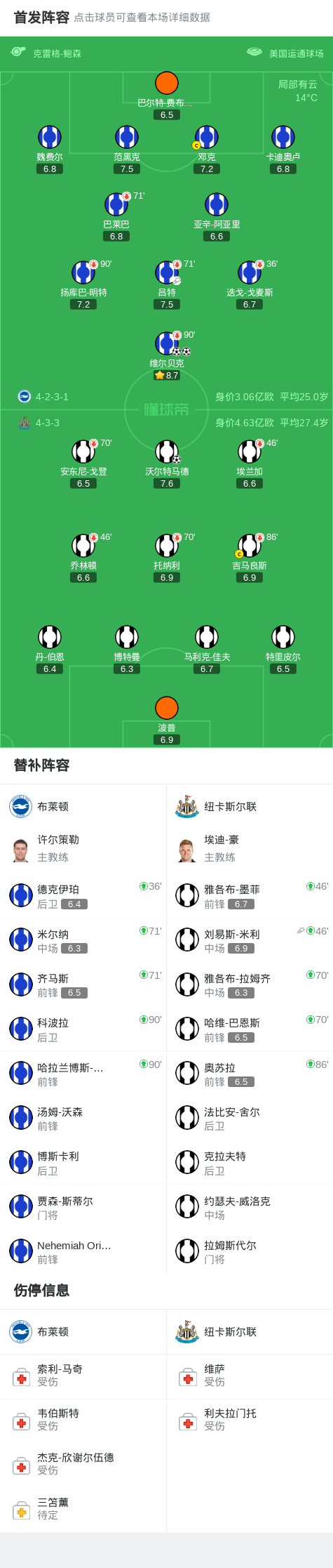 布莱顿2-1纽卡,维尔贝克梅开二度,沃尔特马德脚后跟得分