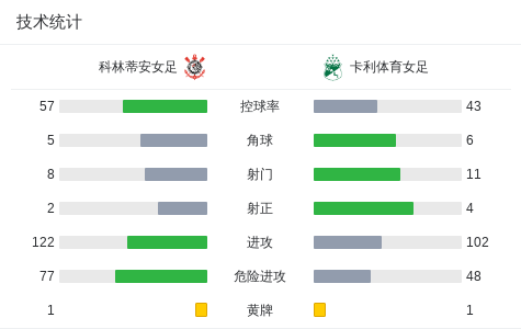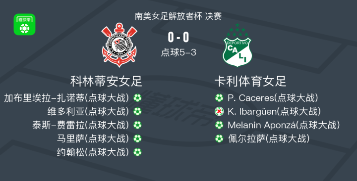 点球大战科林蒂安女足5-3卡利体育女足,加布里埃拉-扎诺蒂点球罚进,K. Ibargüen失点战报bot @懂球帝2025-10-19 05:28北京时间10月19日南美女足解放者杯 决赛,科林蒂安女足对阵卡利体育女足。最终比分科林蒂安女足 5-3 卡利体育女足。点击查看本场比赛详细数据>> 球队阵容 技术统计 展开更多