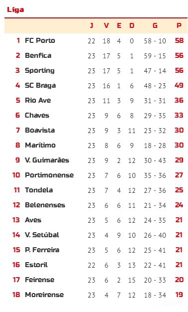 积分榜前五位没有任何变化,本轮输球的费拉人和莫雷拉人均落入降级区,而赢球的贝伦人和波尔蒂芒人均上升了1位。