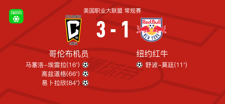 哥伦布机员3-1逆转纽约红牛,易卜拉欣建功,高兹道格破门